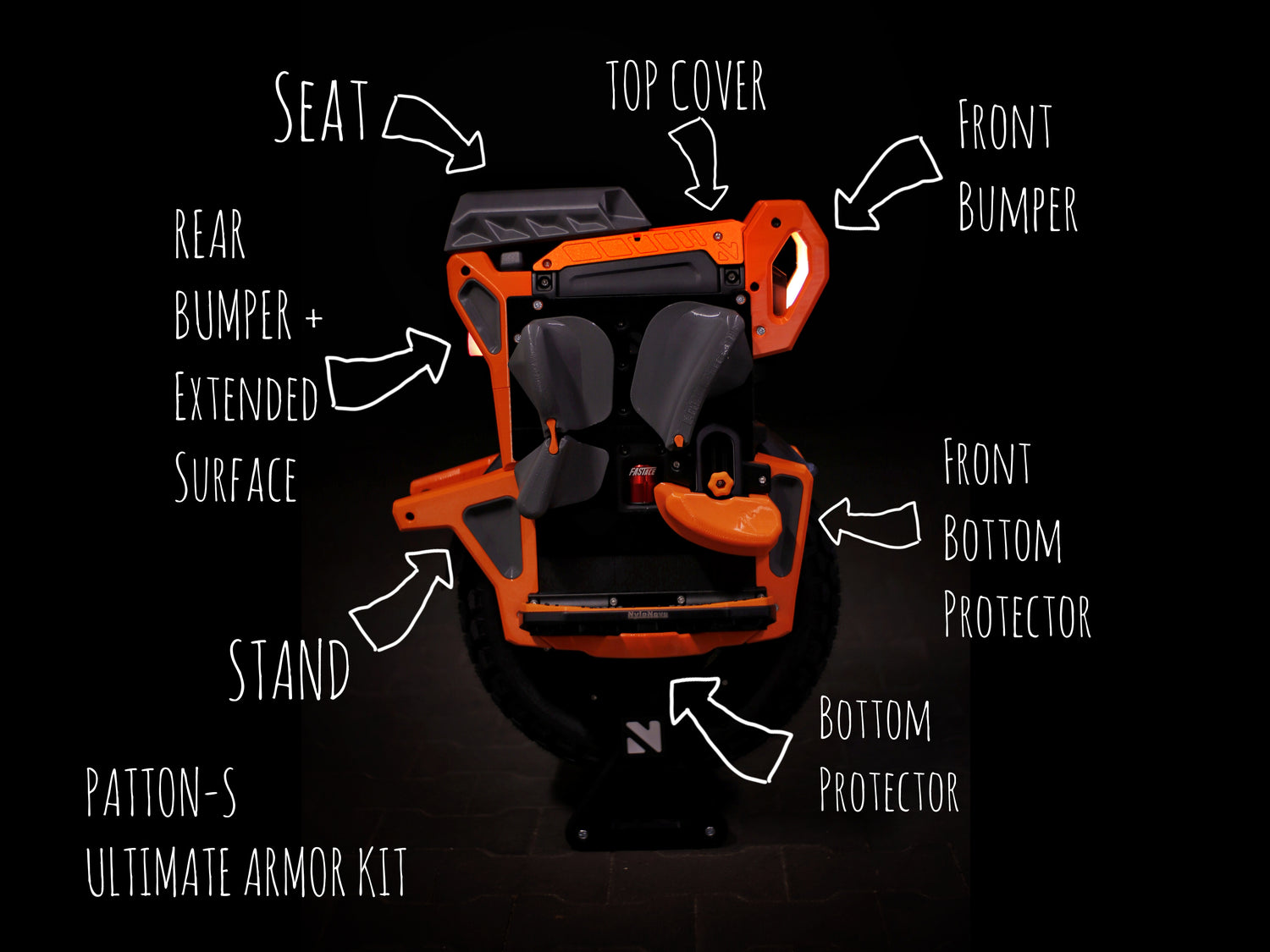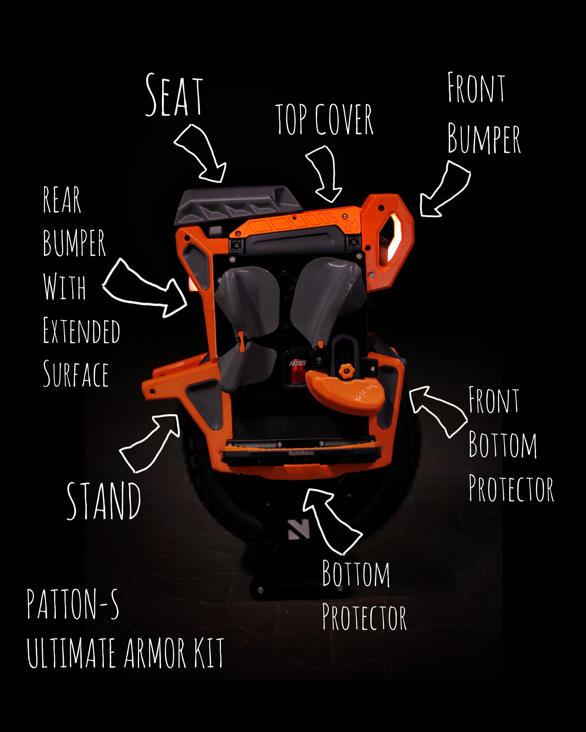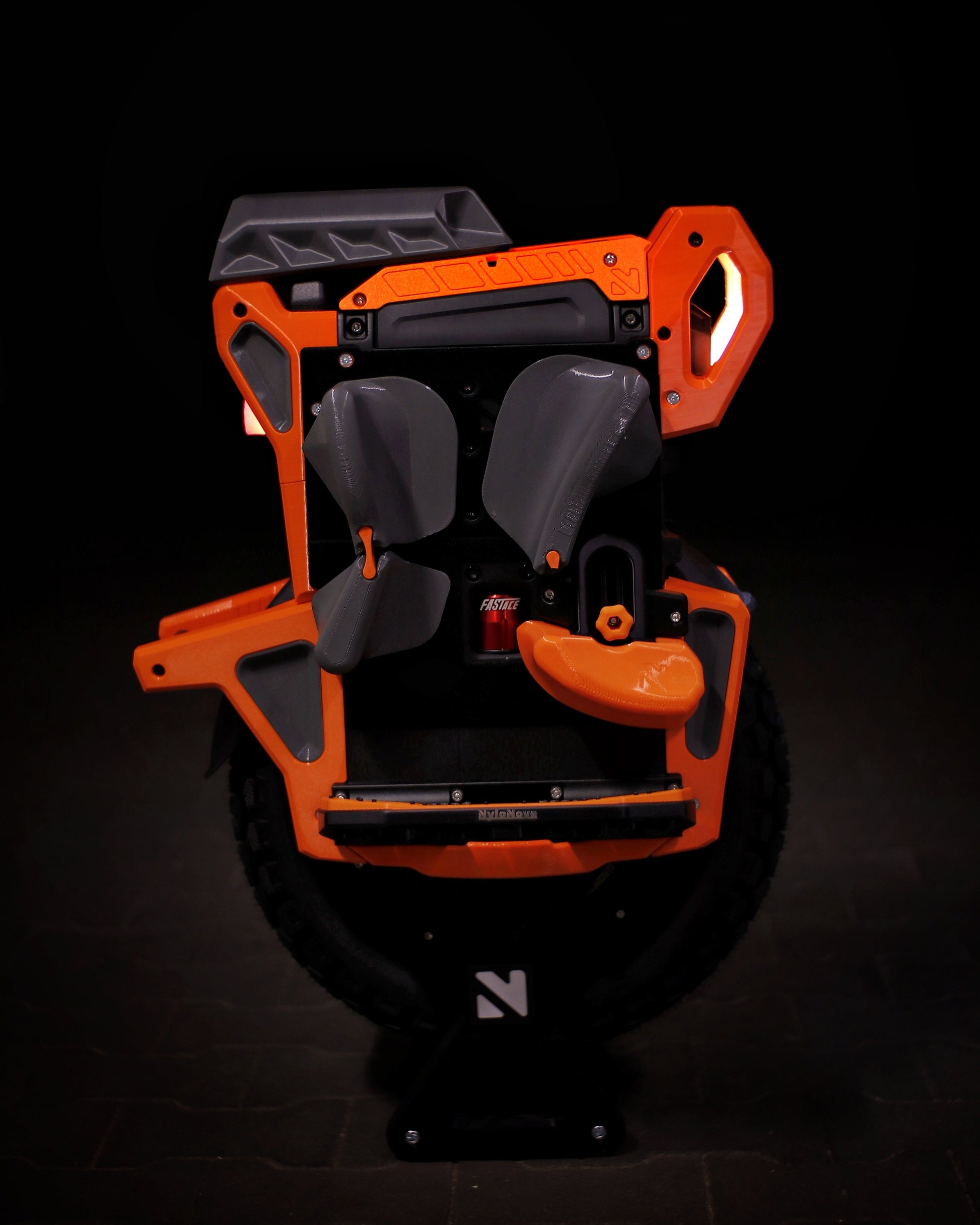 The wheel is protected on all sides, and the surface for pads has been extended. The front bumper, in addition to great protection against frontal impacts, has received additional practical handles that will certainly be useful when carrying the wheel. The lower protective parts have been designed for the best protection and for easy cleaning. The kickstand has been reinforced inside to ensure stability, but at the same time protects the user from unwanted impacts on body parts during a extreme situations